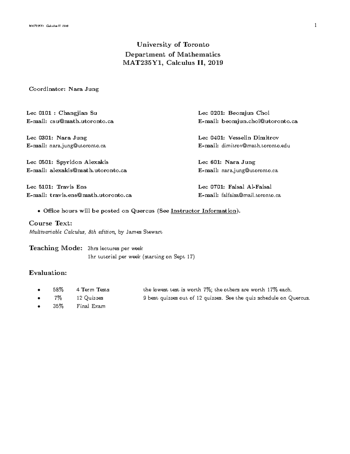 Mat235 19 Course Syllabus Mat235y1 Calculus Ii U Of T Studocu