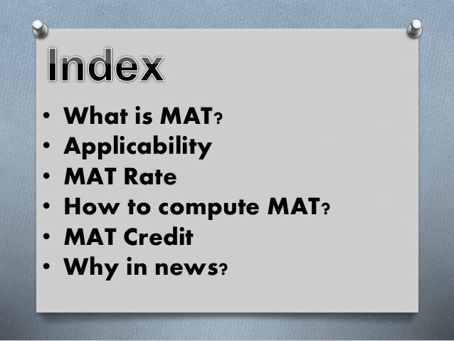 The minimum alternative tax mat is a provision introduced in direct tax laws to limit the tax deductions exemptions otherwise available to taxpayers so that they pay a minimum amount of tax to the government. Minimum alternative tax mat and its computation of book profit and mat credit under section 115jb of income tax act 1961. Download excel format to calculate deferred tax mat and computation of tax for 5 a y. The tax computed by applying 15 plus surcharge and cess as applicable on book profit is called mat.