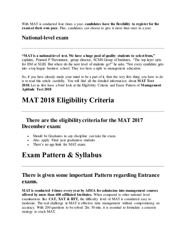 Mat syllabus is prescribed by aima and it includes five sections that are language comprehension intelligence and critical reasoning data analysis and sufficiency mathematical skills and indian and global environment. The below mentioned table can be referred by candidates to check the important dates of mat 2020 for ibt and pbt modes as cbt has been cancelled. The mat exam. Mat is conducted by aima 4 times annually in the months of may september december and february.