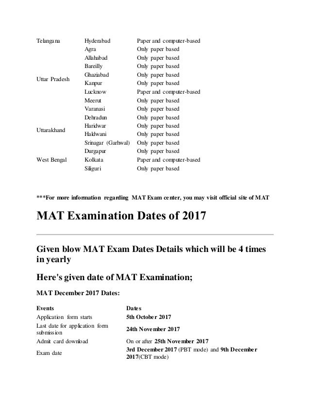 Mat exam centre 2017. The mathematics admissions test mat is a subject specific admissions test lasting 2 hours and 30 minutes and sat under timed conditions. If you are applying for one of the following courses you will be required to sit the mat. In which centres is the mat 2017 held in karnataka. The table below contains past papers and solutions as well as general feedback on the admisisons round for each year from 2010 onwards.