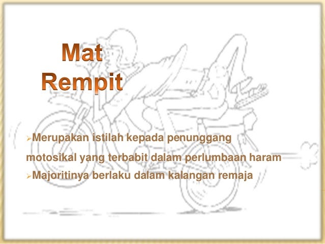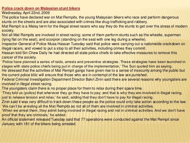 Opinion survey in malaysia we often hear of motorcyclists involved in illegal racing. Known for their kamikaze skills on the road causing chaos in society their unmannered attitude and the current is murdering people. Essay about mat rempit a mat rempit is a malaysian term for an individual who participates in illegal street racing usually involving underbone motorcycles colloquially known as kapcai or scooters. Consequently they tend to be seen as a group that is often associated or involved in social phenomena w.