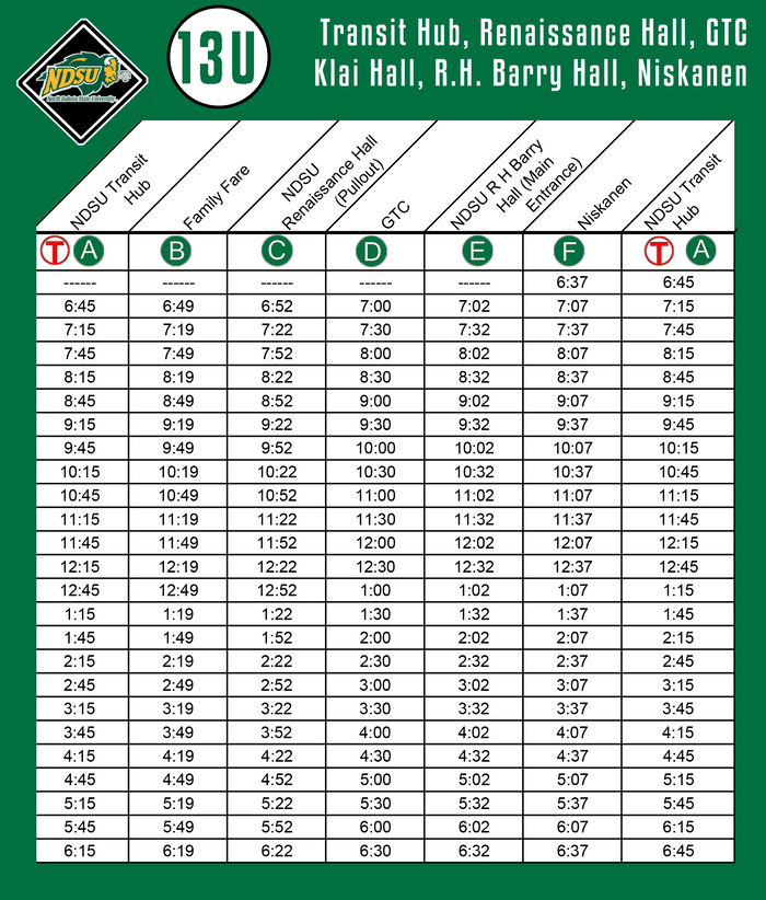 Route 18 departs the gtc every 60 minutes until 8 45pm. Route 13 departs the gtc every 30 minutes until 6 15pm. The nd fargo has 16 bus routes in fargo with 667 bus stops. Matbus operates monday through saturday in the communities of fargo west fargo north dakota and moorhead dilworth minnesota.