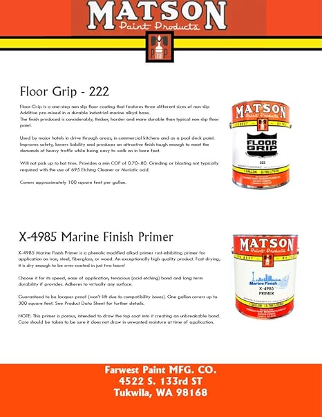 Improves safety lowers liability and produces an attractive finish tough enough. Ts 222 floor grip gallon 96 88 ts 333 floor grip ii gallon 96 98 ts 190 decade deck paint from 107 65 waterbase polyester urethane high gloss kit 214 50. Farwest paint matson div. Contact details 1999 elizabeth street north brunswick nj 08902 phone.