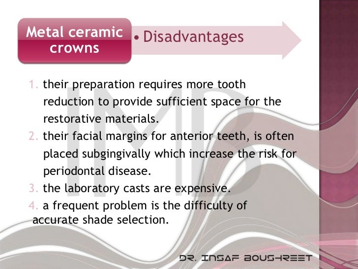 Dentists have been placing porcelain fused to metal crowns for patients since the late 1950s. There is a high degree of difficulty in producing metal crowns which. One of the disadvantages of all porcelain crowns is the fact that they need more reduction of tooth structure even more than in case of pfm crowns. The advantages and disadvantages of metal ceramic restorations in comparison to all ceramic systems are represented and summarized in figure 327 an overview of the different all ceramic systems as well as the advantages and disadvantages of all ceramic crowns is presented on page 192.