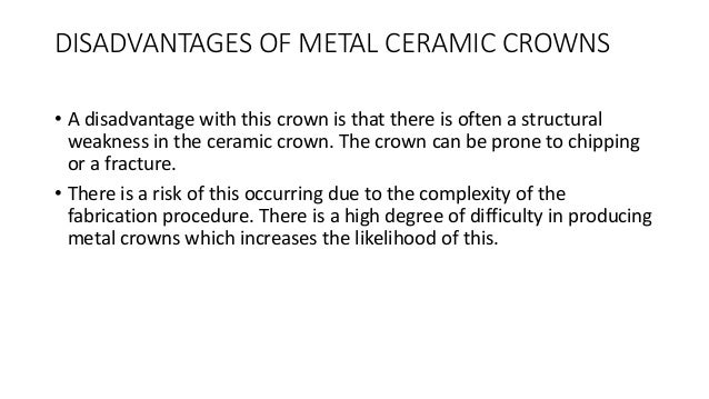 The metal enhances the bonding to the tooth. They are strong and durable we have been using pfm crowns for more than 35 years. Disadvantages of metal ceramic crowns a disadvantage with this crown is that there is often a structural weakness in the ceramic crown. Your geographic location can also affect.