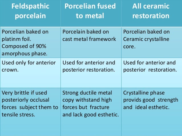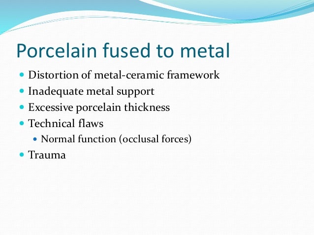 The restoration is more important than the absolute longevity 9. Posterior metal ceramic crowns step no. Since there is a solid connection between the masking ceramic and the metal almost no changes of color will occur in the ceramic construction. Metal for coping of metal ceramic restoration the alloy must have a high melting temperature to withstand high firing temp of porcelain.