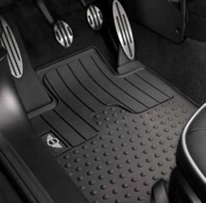 All weather floor mats in black front set of 2 with cooper semblem3 and rear set of 2 textile floor mats with heel pad in black.