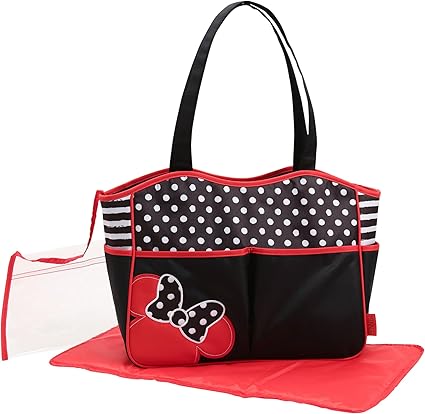 Minnie mouse changing bag changing mat and the small accessory bag and bottle bag changing bag 46x34 cm. Disney minnie mouse changing bag accessories bag with changing mat xl brand. This changing mat features a wipe clean pvc cover and a foam filled interior with raised edges to prevent baby from rolling off and is finished in a beautiful minnie mouse design. It is finished in a beautiful minnie mouse design.