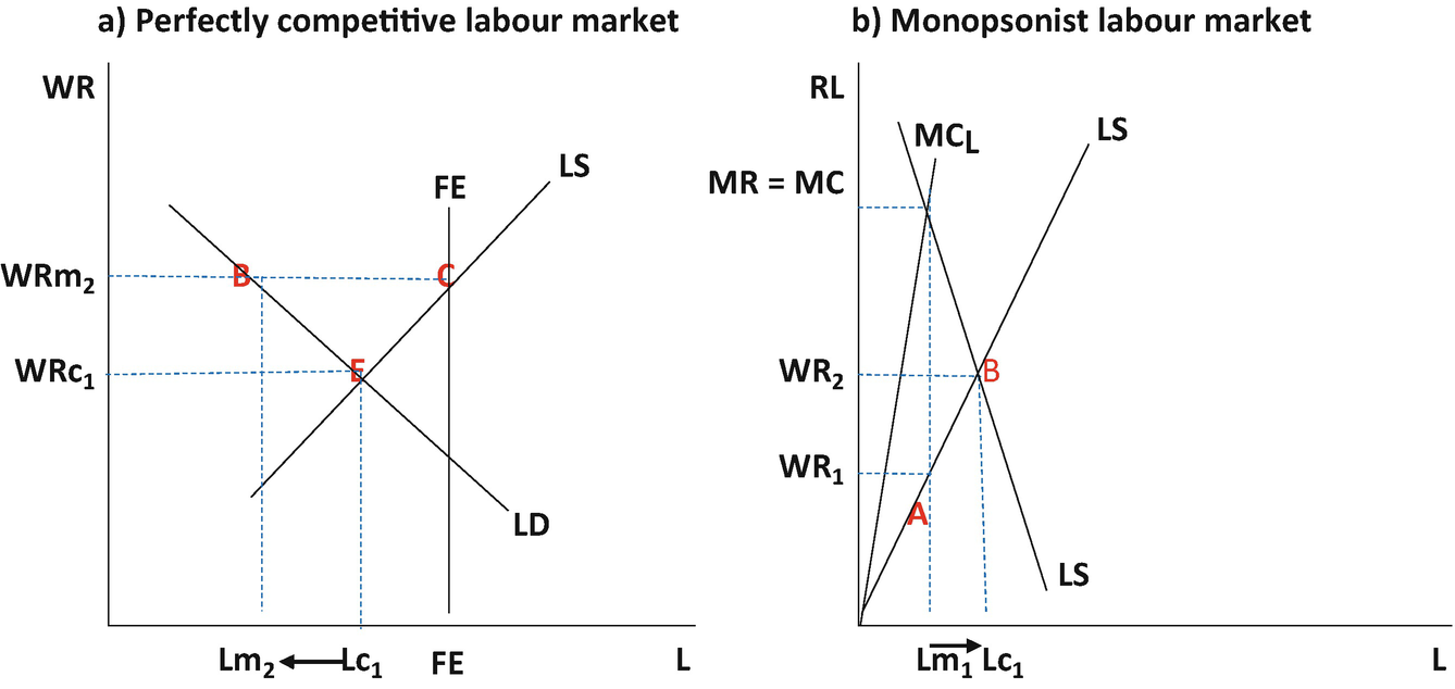 It maximizes profit by employing lm units of labor and paying a wage of 4 per hour. The imposition of a minimum wage of 5 per hour makes the dashed sections of the supply and mfc curves irrelevant. In principle inefficiency from monopsony can be mitigated by a well placed legal price floor which removes the monopsonist s power over price and eliminates its incentive to restrict the quantity it purchases. The imposition of a minimum wage of 5 per hour makes the dashed sections of the supply and mfc curves irrelevant.
